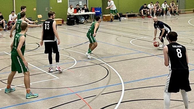 Parallel zur Damenmannschaft trat die erste Herrenmannschaft des TSV Buchen beim SG EK Karlsruhe 2 an. Die Buchener starteten gut ins erste Viertel und konnten durch gezielte Korbaktionen und Freiwürfe punkten. Doch Karlsruhe fand ebenfalls ins Spiel und setzte im ersten Viertel gleich fünf Dreier. Nach einem punktereichen Auftakt mit insgesamt 53 Punkten fanden beide Teams im zweiten Viertel defensive Antworten und erschwerten die Offensive des Gegners. Die Karlsruher Halle bot mit ihrem kleinen Spielfeld wenig Platz für schnelle Angriffe oder Spielzüge unter dem Korb, was die Gäste weiter ausbremste. Zur Halbzeit lagen die Buchener mit 42:39 zurück.