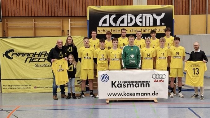 Kurz vor dem Spiel wurde der neue Trikotsatz des Teams offiziell übergeben – ein herzlicher Dank geht dabei an die Sponsoren Fahrschule Academy-Schäufele und Autohaus Käsmann. Erstmals im neuen Outfit starteten die Jung-PiranHAs um 13:30 Uhr in ihr Spiel.