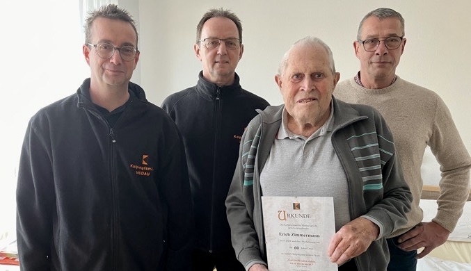 Im Anschluss ehrten Manfred Dambach und Thomas Streun Jasmin Mechler für 25 Jahre Mitgliedschaft bei der Kolpingfamilie Mudau. Helmut Maier, immer ein Aktivposten, wenn es um Elektroarbeiten geht, freute sich darüber, seit 50 Jahren ein Kolpingbruder zu sein. Heinz Gimbert und Erich Zimmermann waren auf den Tag genau vor 60 Jahren in die Kolpingfamilie eingetreten. Erich Zimmermann, der sich viele Jahre um die Bänke an der Fatimakapelle gekümmert hat, konnte bei der Feierstunde nicht dabei sein. Er wurde später vom Vorstandstrio Manfred Dambach, Thomas Streun und Andreas Schölch im Seniorenheim Geras besucht, wo ihm die Urkunde übergeben werden konnte.