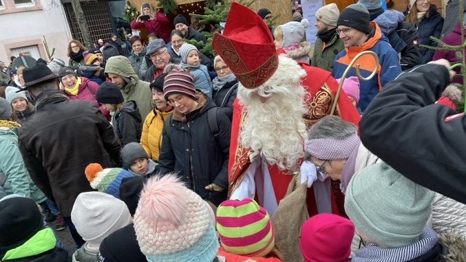 Selbst der Bischof Nikolaus (Markus Hohn) zeigte sich erneut begeistert von der Odenwaldgemeinde. Bereits zum dritten Mal innerhalb einer Woche steuerte er seinen Schlitten zum Mudauer Weihnachtsmarkt – mit einem prall gefüllten Sack voller Süßigkeiten im Gepäck.