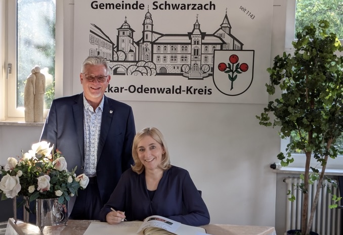 Im Beisein von Bürgermeister Mathias Haas trägt sich Bundesgesundheitsministerin Nina Warken in Goldene Buch der Gemeinde Schwarzach ein. (Foto: pm)
