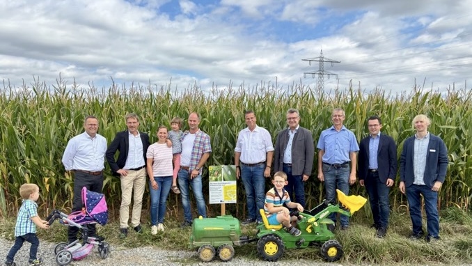 Philipp Sack stellte auf seinem Betrieb das Schild ‚Wir bauen den biologischen Pflanzenschutz aus!‘ auf. Auf den Äckern seines Betriebes wird unter anderem Mais angebaut, der nicht selten vom Maiszünsler parasitiert wird und dann Ernteausfälle verursacht.