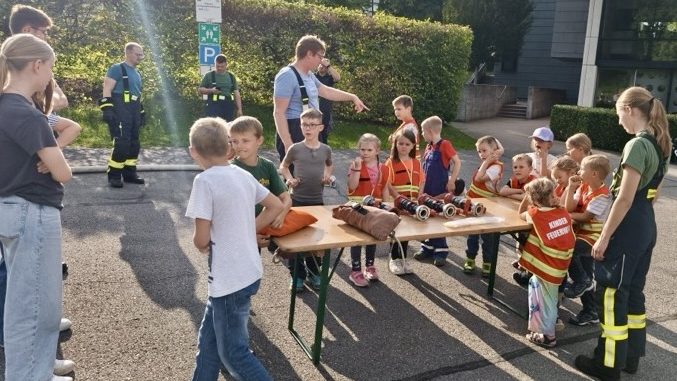 Mit großen Augen und gespannter Erwartung verfolgten die Kinder und Jugendlichen den Versuch. Zunächst wurde – ganz wie bei einem realen Einsatz – eine stabile Wasserversorgung vom Hydranten aufgebaut. Der erste Test, den Tisch mit Wasserkraft zum Schweben zu bringen, schlug fehl. Doch so leicht gaben sich die Floriansjünger nicht geschlagen.