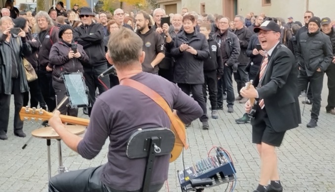 Ab 16.30 Uhr füllte sich der Platz vor dem Rathaus. Viele trugen schwarze Kleidung, AC/DC- oder Wacken-Shirts, manche die Hitparadenkatze auf dunklem Stoff. Für Essen und Trinken sorgten der Rolling-Stones-Fanclub, Eltern der Schefflenztalschule und der Kindergarten. Die HOSSA-Guggemusik brachte das Publikum in Stimmung, während die Kinder auf der Hüpfburg tobten.